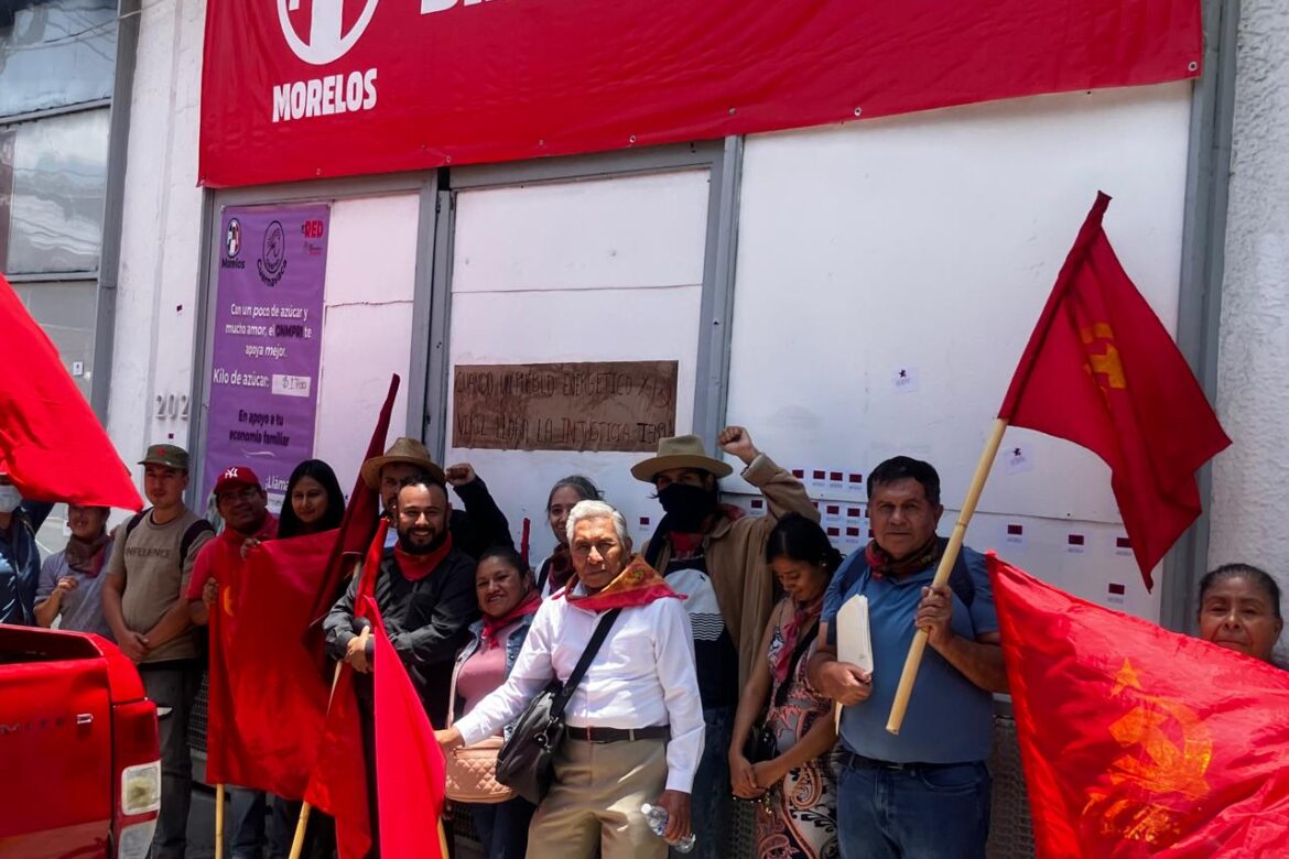 Militantes del Partido Comunista de México realizaron un acto de repudio afuera de las oficinas del PRI Morelos.