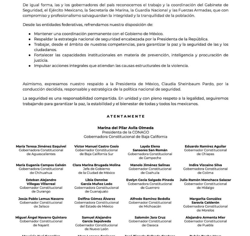 La morelense se sumó con su firma, a un pronunciamiento emitido –la tarde de este domingo– por los gobernadores y gobernadoras del país, tras el abatimiento de Nemesio Oseguera Cervantes, alias el Mencho, líder del Cartel Jalisco Nueva Generación (CJNG).
