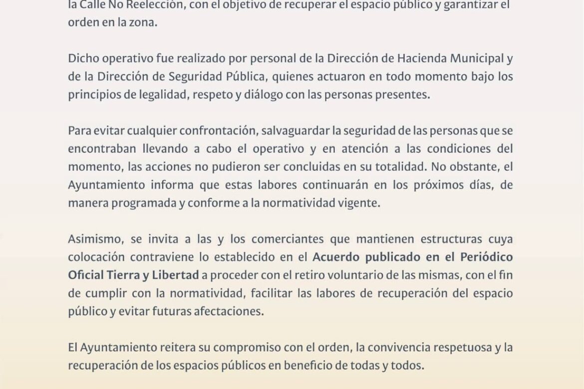 La comuna invitó a las y los comerciantes a retirar voluntariamente cualquier estructura que contravenga el Acuerdo publicado en Tierra y Libertad.