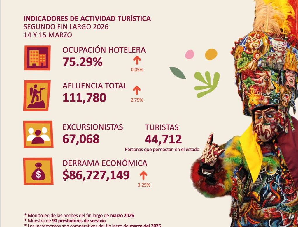 Morelos recibió 111 mil 780 visitantes durante el segundo fin de semana largo de marzo, lo que generó una derrama económica de 86 millones 727 mil pesos y una ocupación hotelera promedio de 75.29 por ciento.