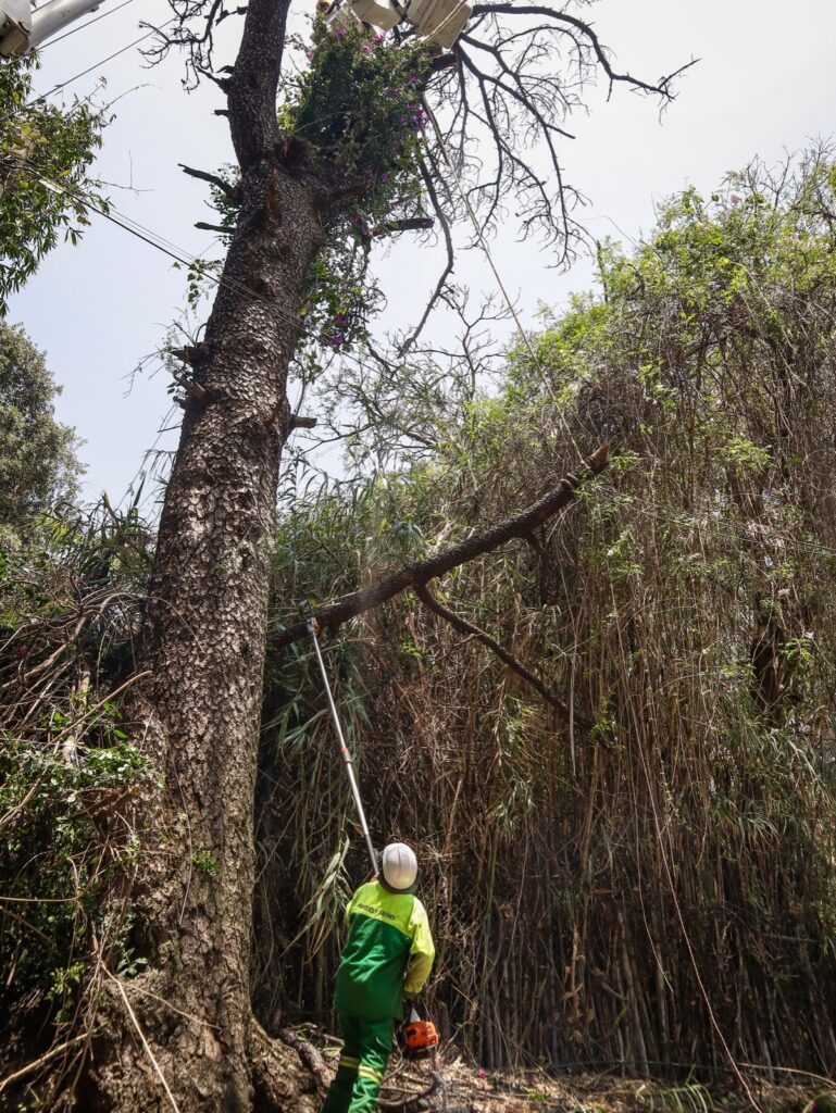 Personal de la Secretaría de Desarrollo Sustentable y Servicios Públicos del Ayuntamiento de Cuernavaca, de las áreas de parques y jardines. en coordinación con la Comisión Federal de Electricidad (CFE), realizaron trabajos integrales de poda mayor y retiro de un individuo árbol (OCOTE) de 18 metros, en riesgo de colapso, Sobre las inmediaciones de la calle Camino a la Montaña en el poblado de Santa María Ahuacatitlán.