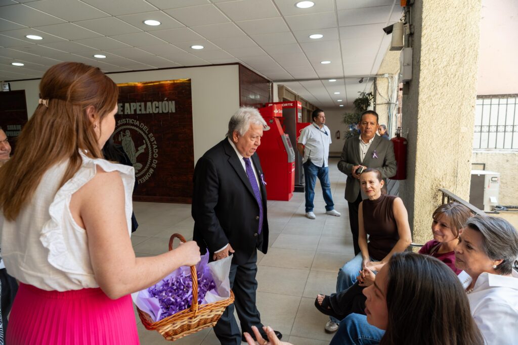 En el marco del Día Internacional de la Mujer, el Magistrado Presidente del Tribunal Superior de Justicia del Estado de Morelos (TSJEM), Juan Emilio Elizalde Figueroa, inició la colocación de moños morados a trabajadoras y trabajadores del Poder Judicial en la sede Leyva, iniciativa que será replicada en todas las sedes del Poder Judicial en la entidad.