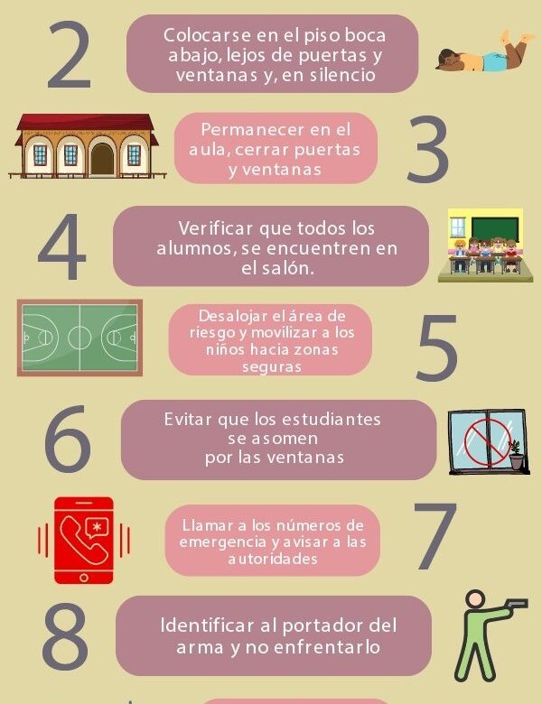 Ante ello, señaló que este protocolo maneja tres supuestos, el primero que un estudiante porta un arma, el segundo amenazas por personas externas con armas y el último, detonaciones de arma de fuego, contando con los principios de prevención, seguridad, colaboración, comunicación, capacitación, apoyo a las víctimas y evaluación para la mejora continua.