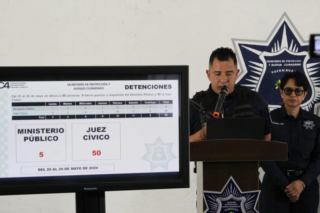 La Secretaría de Protección y Auxilio Ciudadano (SEPRAC) de Cuernavaca informa que del 20 al 26 de mayo se detuvieron a 55 personas, de las cuales cinco fueron puestas a disposición del Ministerio Público y 50 al Juez Cívico por diversos delitos del fuero común y federal, así como por faltas administrativas, siendo el sábado el día con mayor incidencia al registrar un total de 17 detenciones.