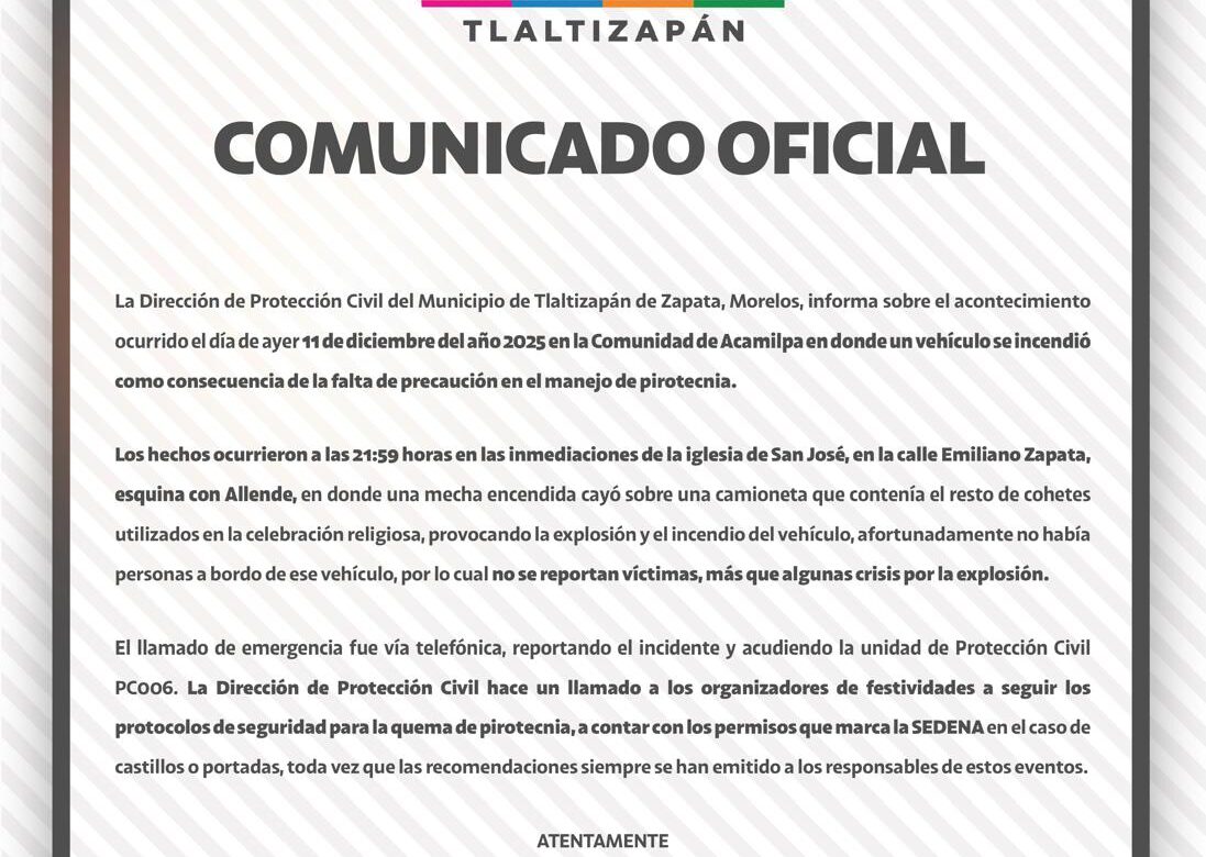 La Dirección de Protección Civil del Municipio de Tlaltizapán de Zapata, Morelos, informa sobre el acontecimiento ocurrido el 11 de diciembre en la Comunidad de Acamilpa en donde un vehículo se incendió como consecuencia de la falta de precaución en el manejo de pirotecnia.