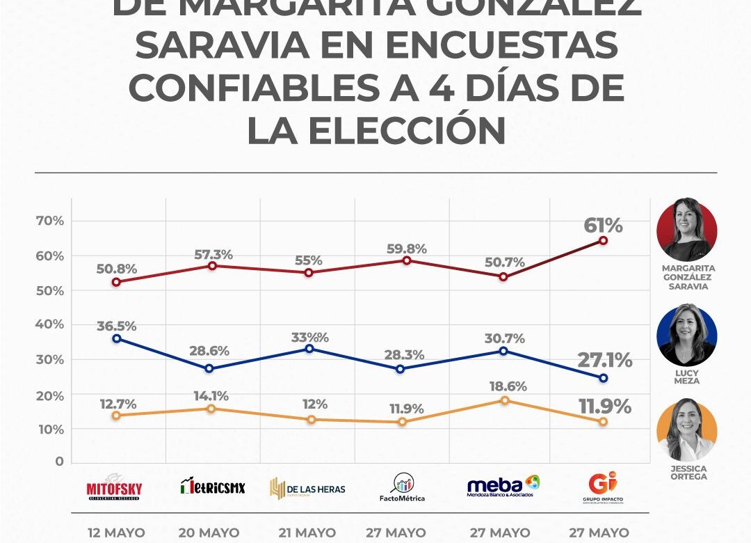 • Estiman 22 puntos de diferencia entre la candidata de Morena y la representante del PRI, PAN y PRD