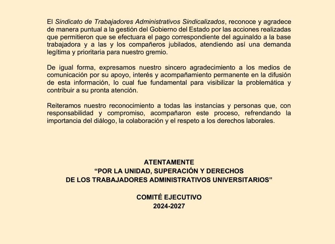 En un comunicado, el gremio sindicalizado universitario agradecio las acciones realizadas que permitieron que se efectuara el pago correspondiente del aguinaldo a la base trabajadora y a las y los compañeros jubilados, “atendiendo asi una demanda legitima y prioritaria para nuestro gremio”.