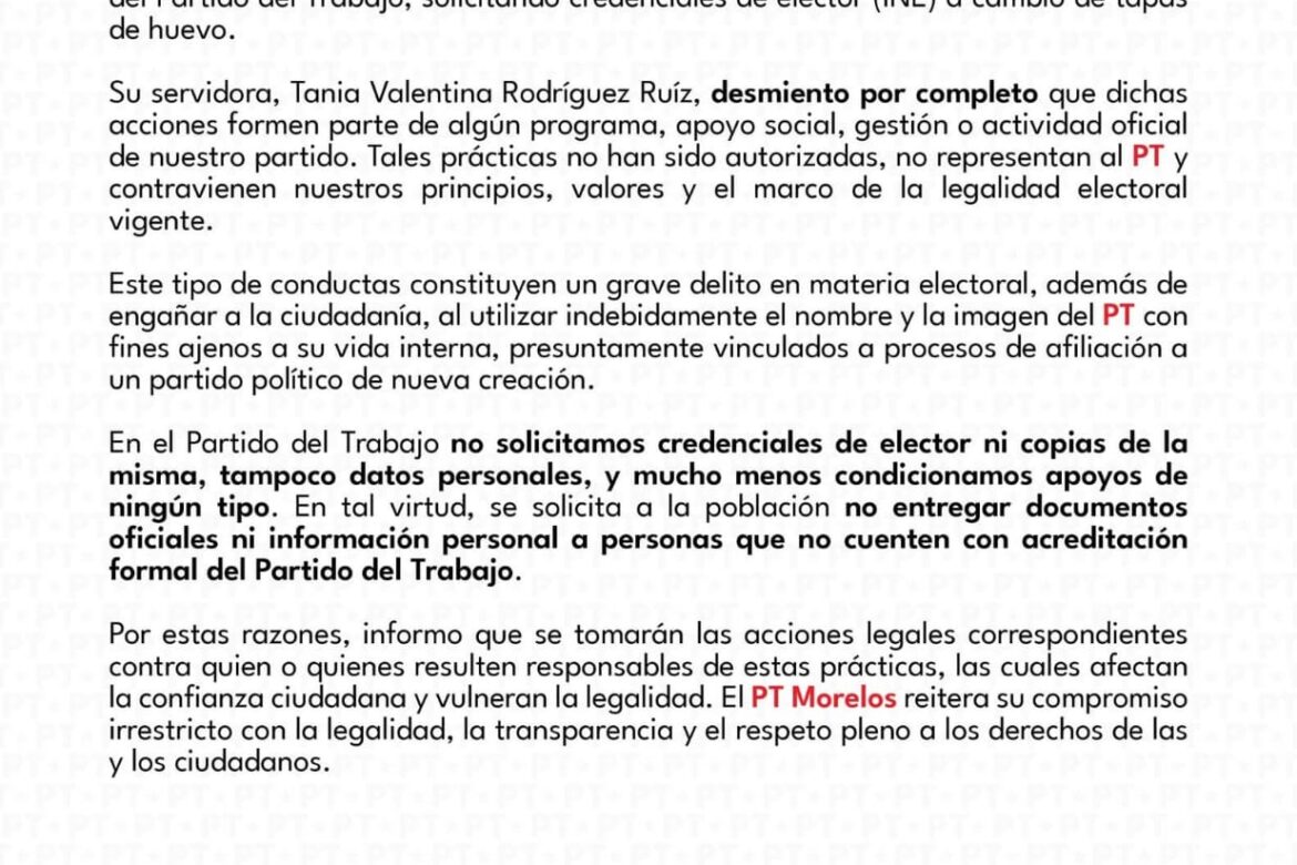 La dirigente y diputada local alertó específicamente a los habitantes del estado y, en particular, del municipio de Atlatlahucan, sobre personas que se presentan falsamente en su nombre y del partido para solicitar la credencial de elector (INE) a cambio de “tapas de huevo”. Rodríguez Ruiz fue enfática al señalar que estas prácticas no han sido autorizadas, no forman parte de ningún programa oficial y contravienen los principios, valores y la legalidad electoral del PT.