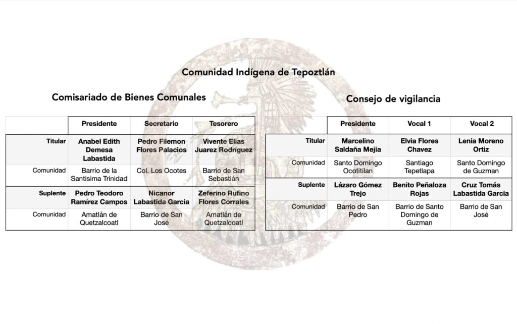 En respeto a los usos y costumbres, la Asamblea Comunitaria de Pueblos, Barrios y Colonias de Tepoztlán impulsó una planilla única del pueblo y el pasado 22 de marzo, la Asamblea ratificó unánimemente el desconocimiento de las autoridades previas, calificadas como ilegales, y eligió a la nueva representación.