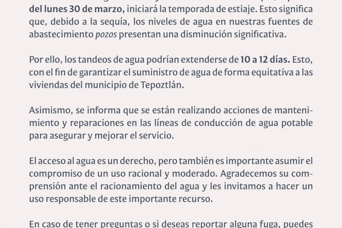 La Dirección de Agua Potable y Saneamiento del Ayuntamiento de Tepoztlán, dio a conocer que este lunes 30 de marzo, inició formalmente la temporada de estiaje. Explicaron que debido a la sequía, los niveles en los pozos de abastecimiento han disminuido considerablemente, por lo que; para garantizar una distribución equitativa en todo el municipio, los tandeos de agua podrán extenderse de 10 a 12 días.