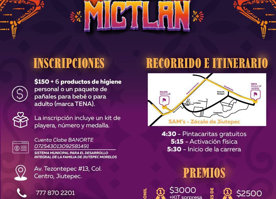 El Ayuntamiento y el DIF Jiutepec te invitan a participar en la gran carrera Mictlán 5K. 🤝
