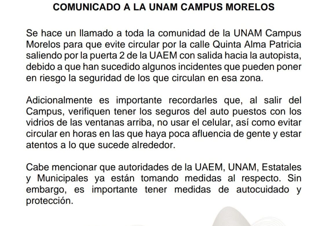 Lo anterior, luego de que la Coordinación de Servicios Administrativos del Campus Morelos de la UNAM, emitiera un comunicado en el que hace un llamado a toda la comunidad universitaria “para que evite circular por la calle Quinta Alma Patricia saliendo por la puerta 2 de la UAEM con salida hacia la autopista, debido a que han sucedido algunos incidentes que pueden poner en riesgo la seguridad de los que circulan en esa zona”.