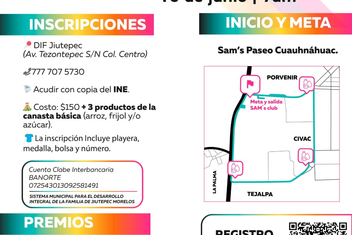 👟🏃♀️ El Ayuntamiento de Jiutepec te invita a la 1ra Carrera por la Familia 5K, organizada por el DIF Municipal.