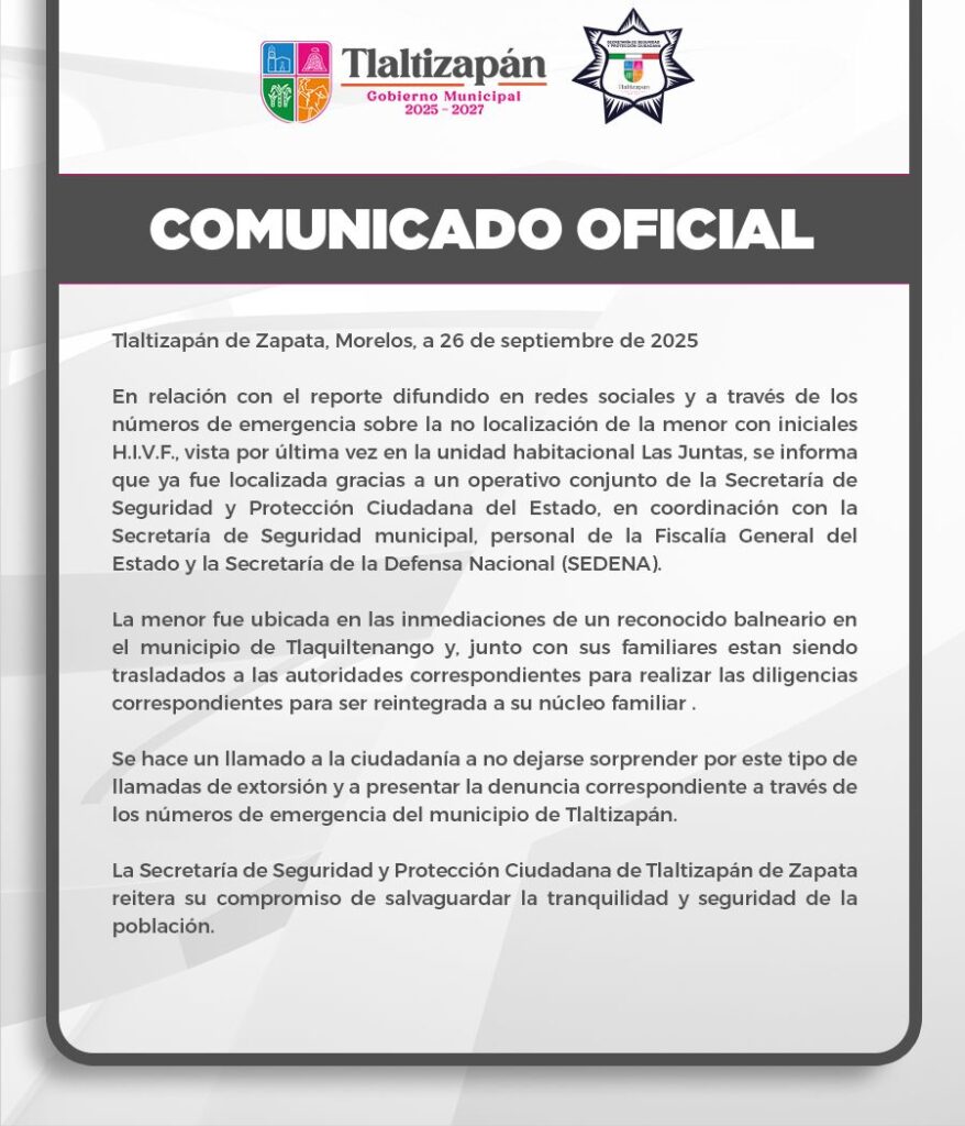 En relación con el reporte difundido en redes sociales y a través de los números de emergencia sobre la no localización de la menor con iniciales H.I.V.F., vista por última vez en la unidad habitacional Las Juntas, se informa que ya fue localizada gracias a un operativo conjunto de la Secretaría de Seguridad y Protección Ciudadana del Estado, en coordinación con la Secretaría de Seguridad municipal, personal de la Fiscalía General del Estado y la Secretaría de la Defensa Nacional (SEDENA).